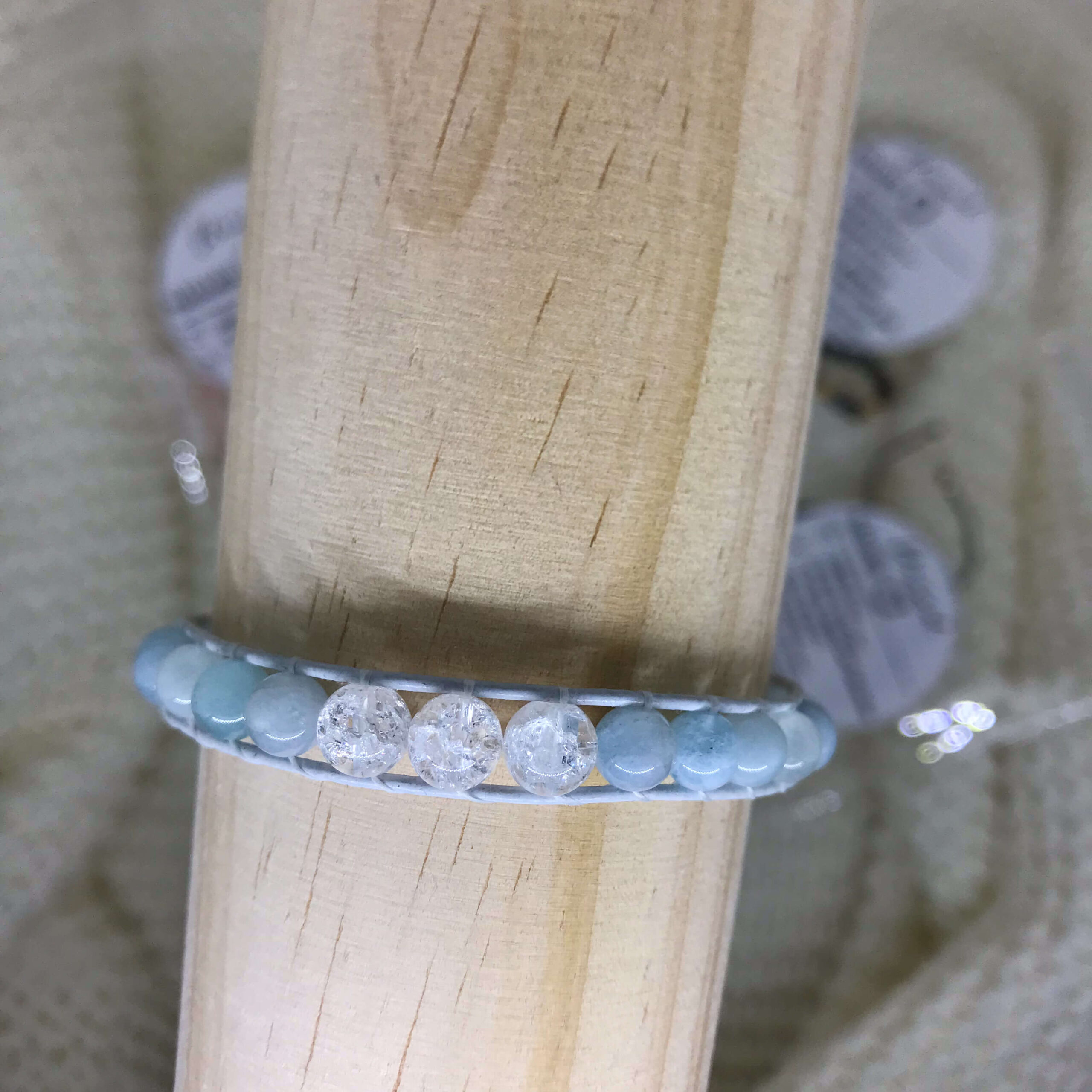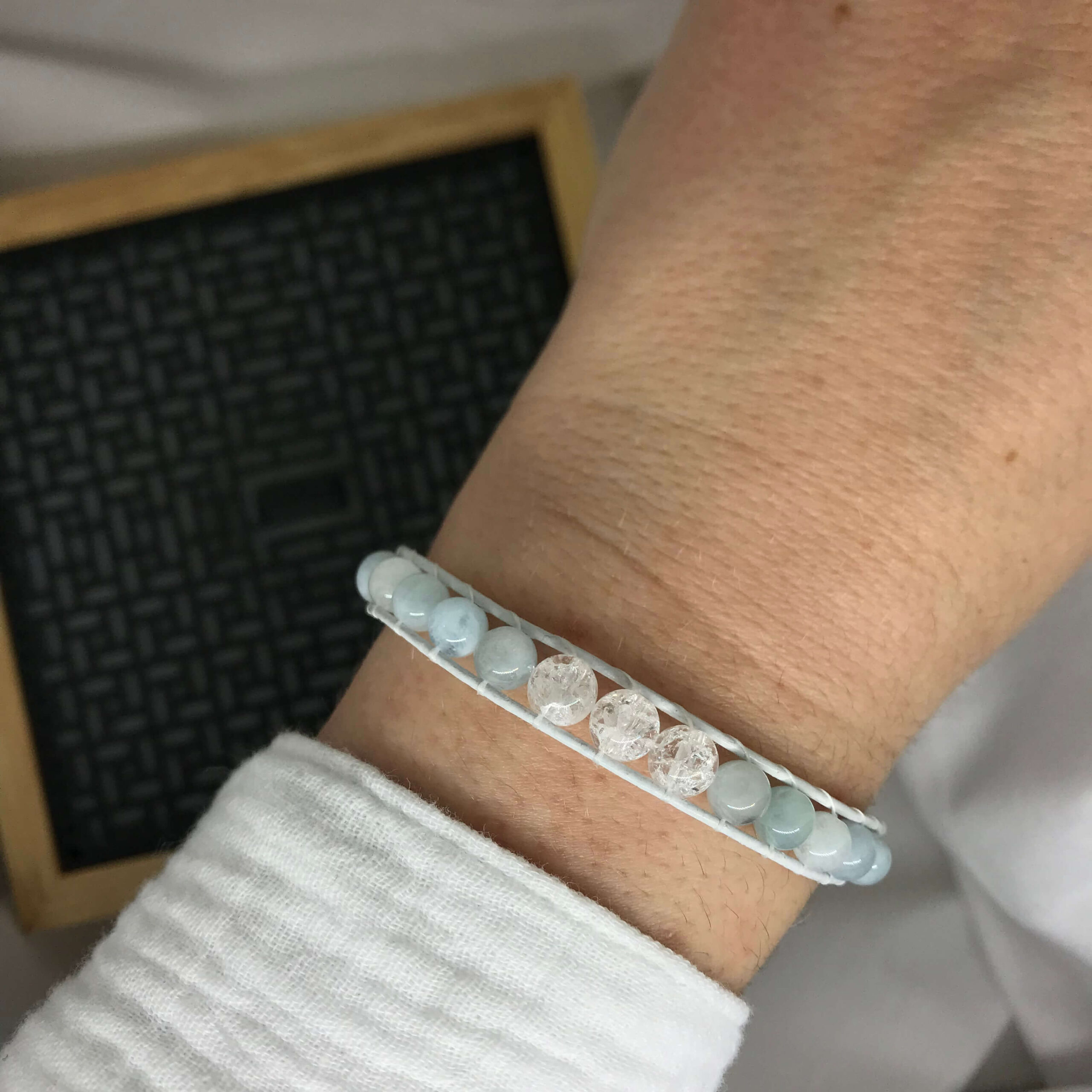 Andělský minerální náramek s korálky akvamarínu a křišťálu na bílém koženém řemínku.