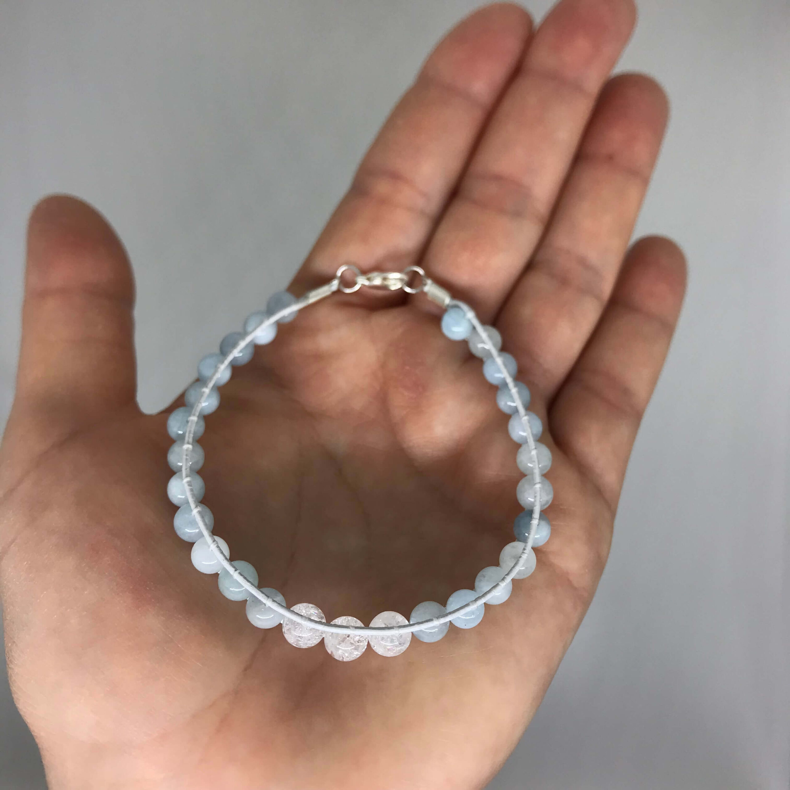 Minerální náramek s korálky akvamarínu a praskaného křišťálu na bílém koženém řemínku a s karabinkou v barvě stříbra. Krásný dárek pro Vás či Vaše blízké.