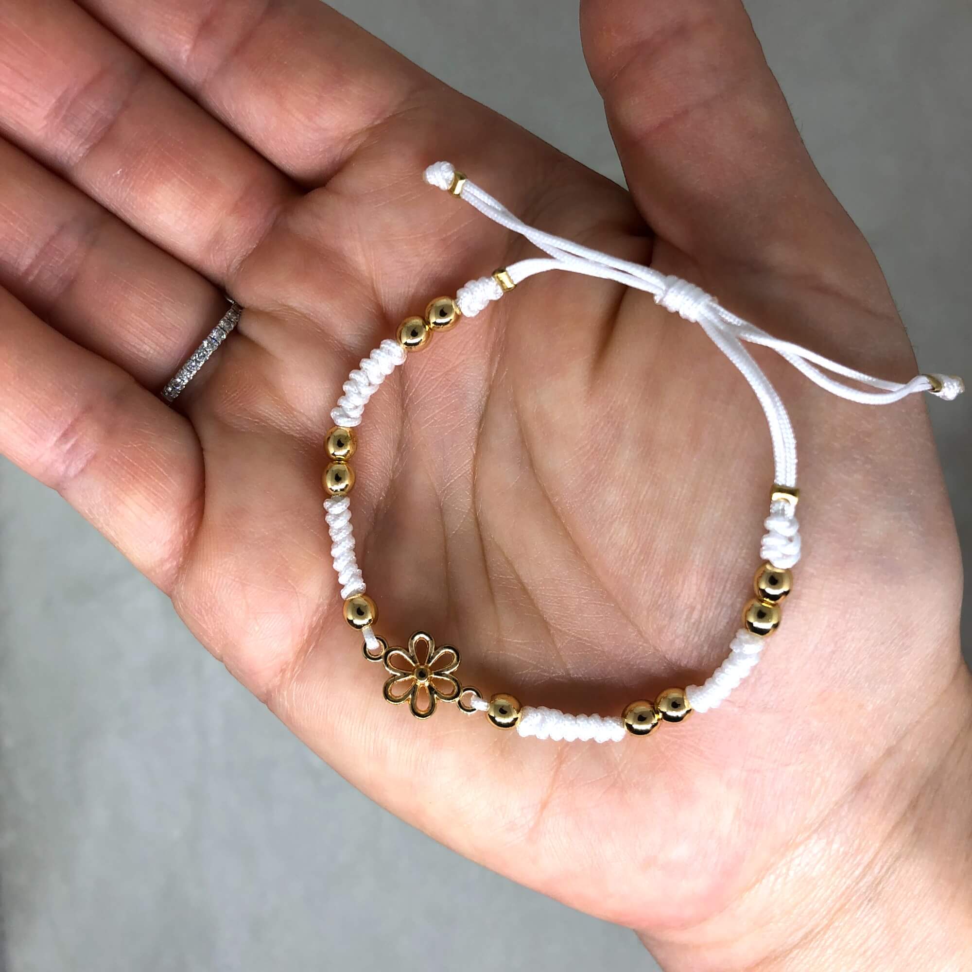 Elegantní macramé náramek v bílé barvě. Dominantou náramku je něžná květina v barvě zlata. Náramek je po obvodu doplněn o korálky minerálních kamenů zlatého hematitu.