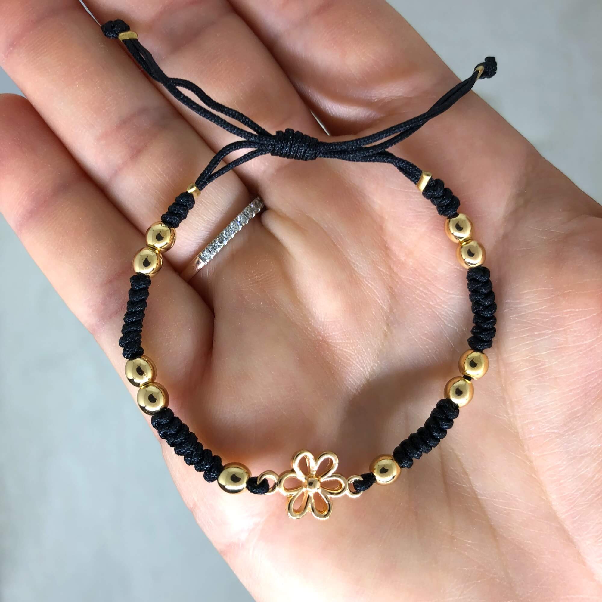 Elegantní macramé náramek v černé barvě. Dominantou náramku je něžná květina v barvě zlata. Náramek je po obvodu doplněn o korálky minerálních kamenů zlatého hematitu.