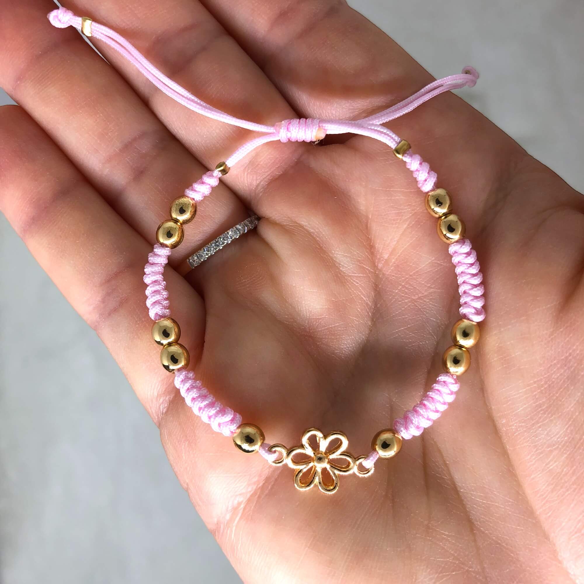 Elegantní macramé náramek v růžové barvě. Dominantou náramku je něžná květina v barvě zlata. Náramek je po obvodu doplněn o korálky minerálních kamenů zlatého hematitu.