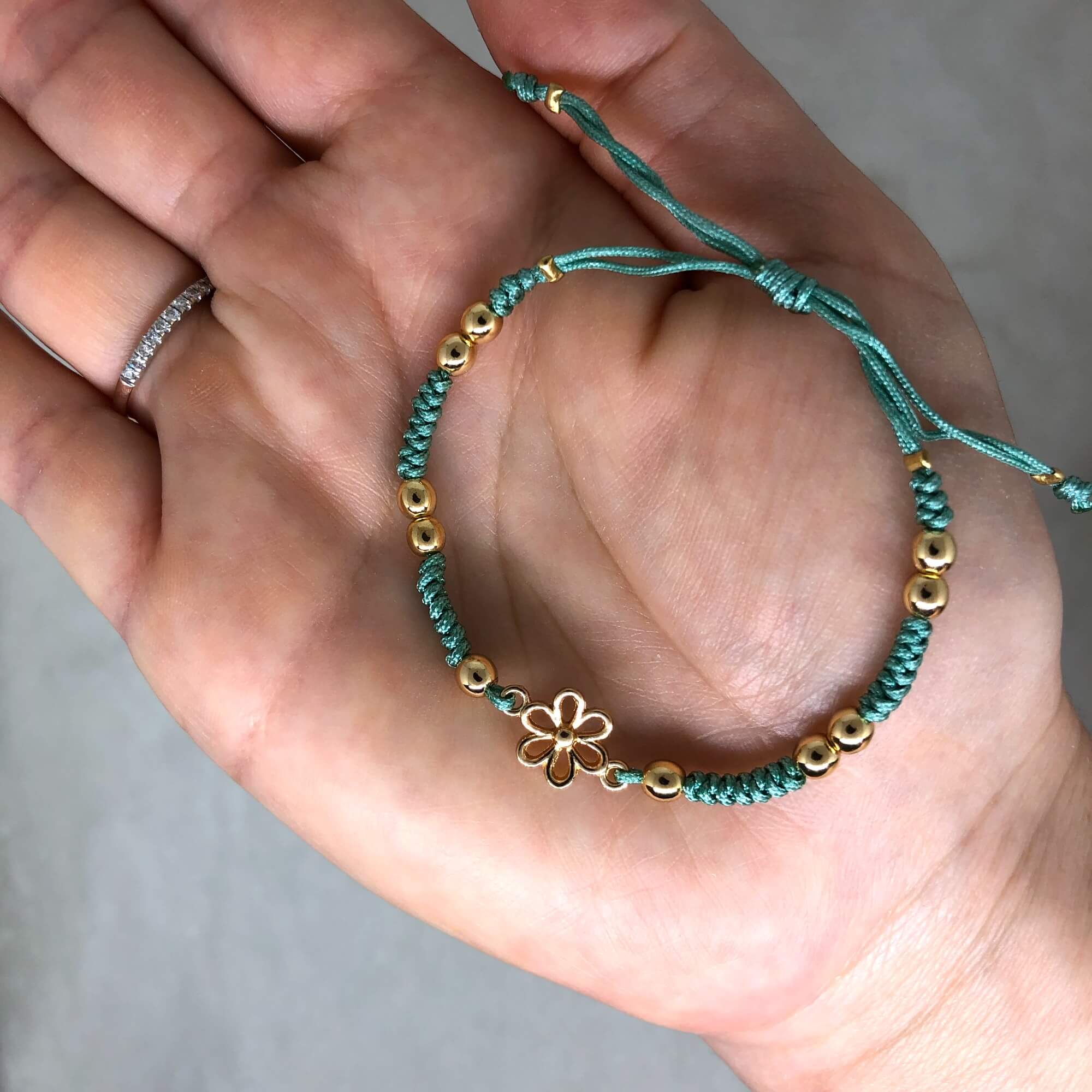 Elegantní macramé zelený náramek. Dominantou náramku je něžná květina v barvě zlata. Náramek je po obvodu doplněn o korálky minerálních kamenů zlatého hematitu.