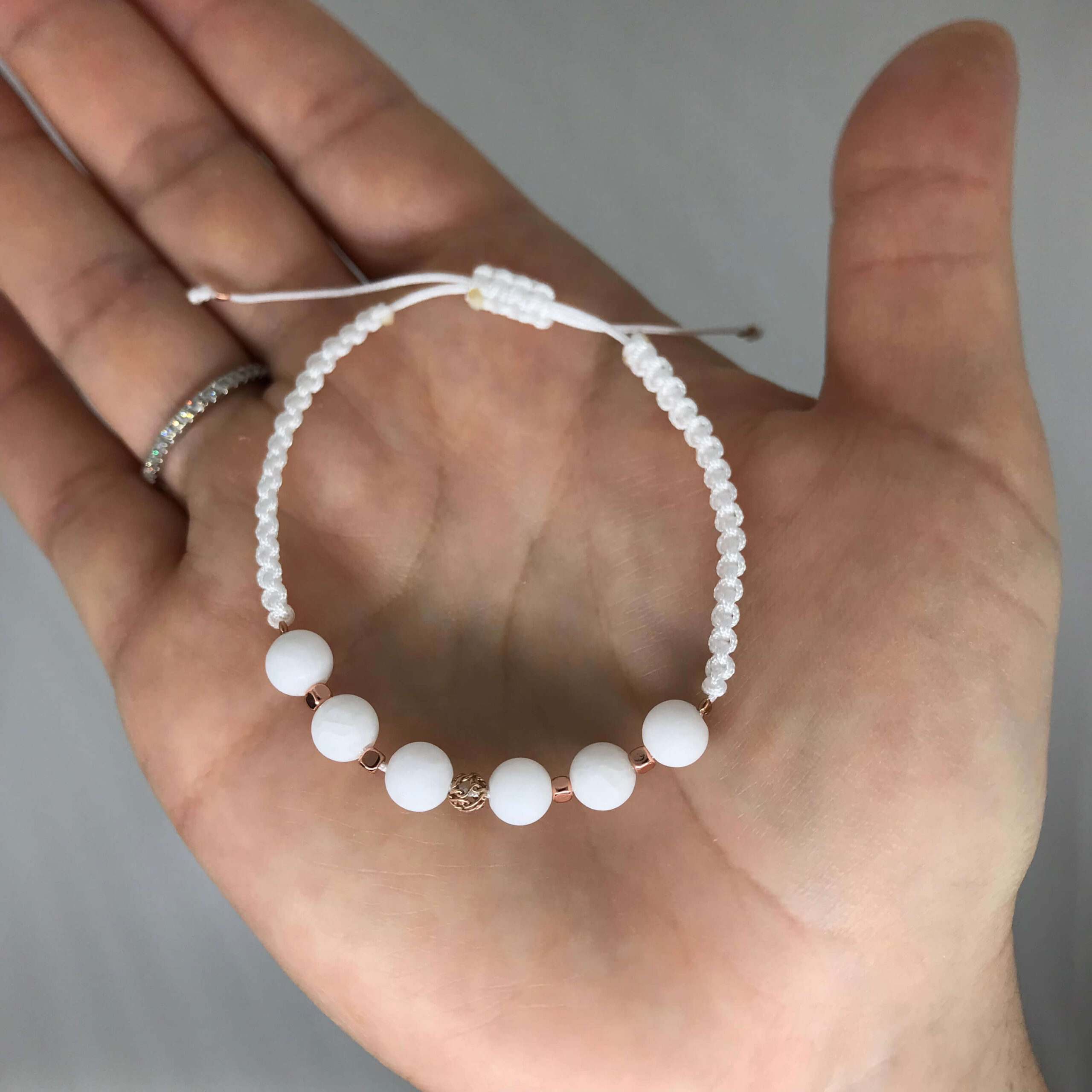 Filigránový design korálku je jemný a ženský, perfektně doplňuje jemnost, decentnost a svěžest bílého jadeitu. Dotek růžového zlata dodává náramku luxusní a elegantní vzhled.