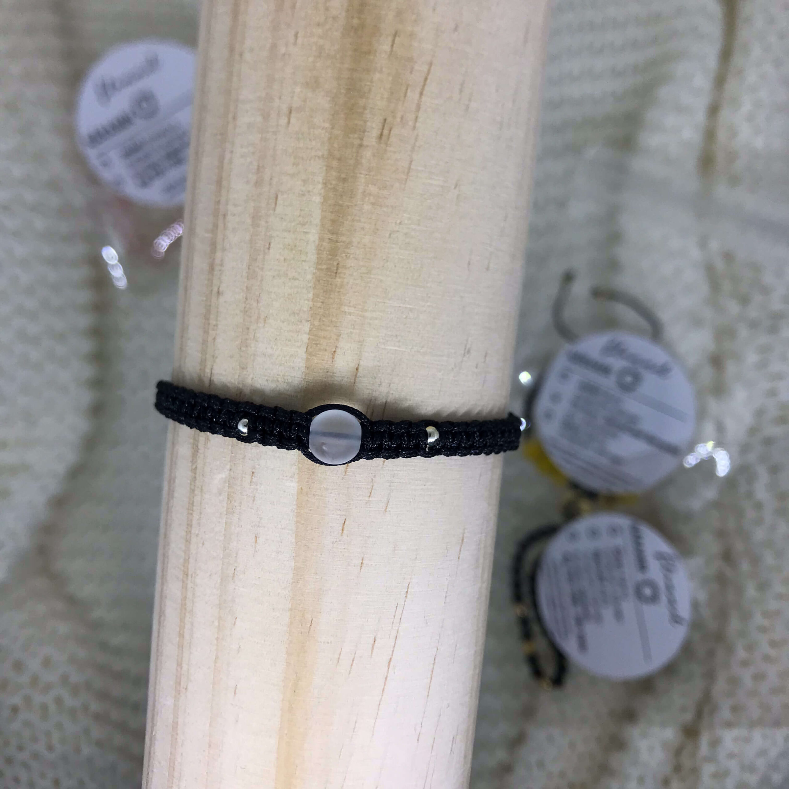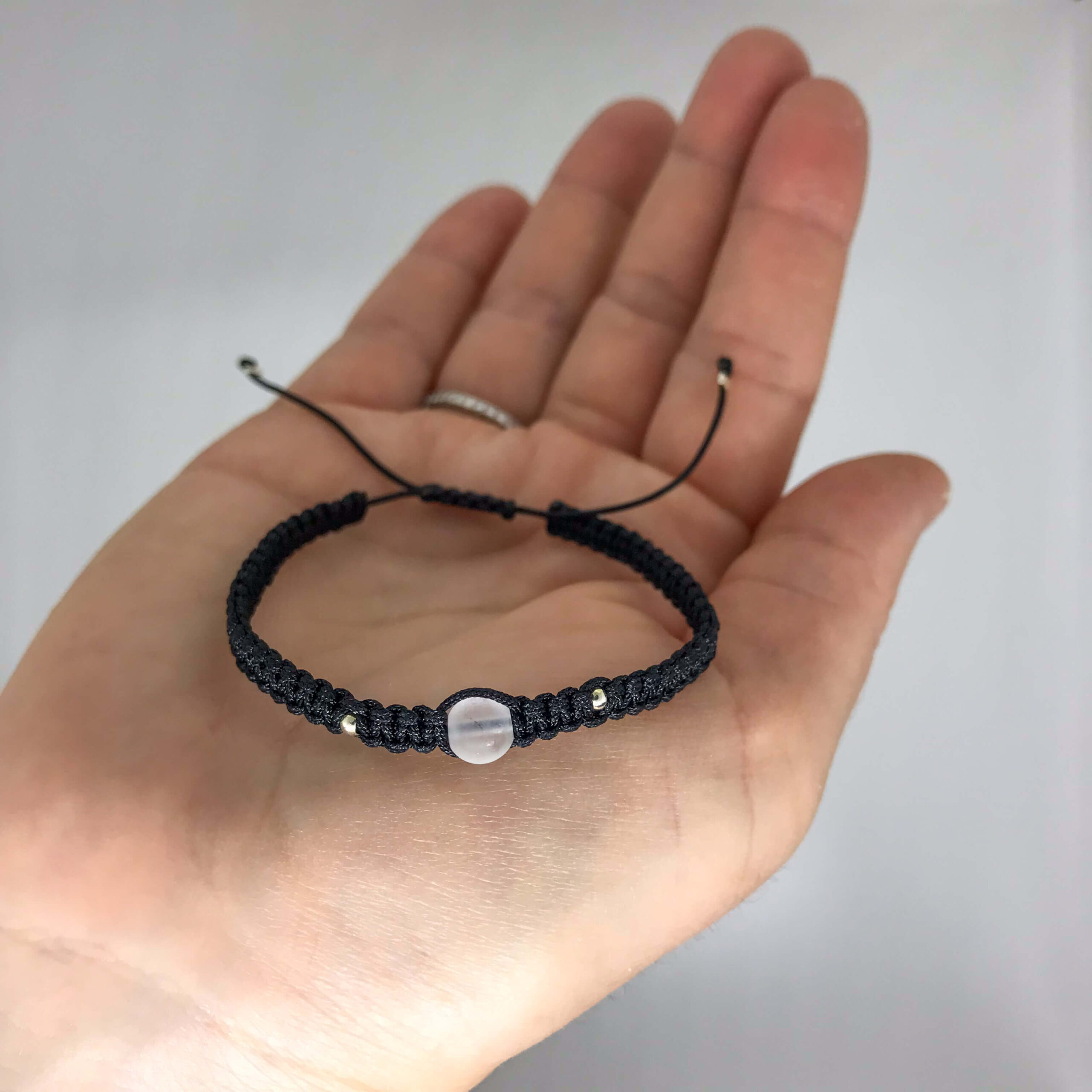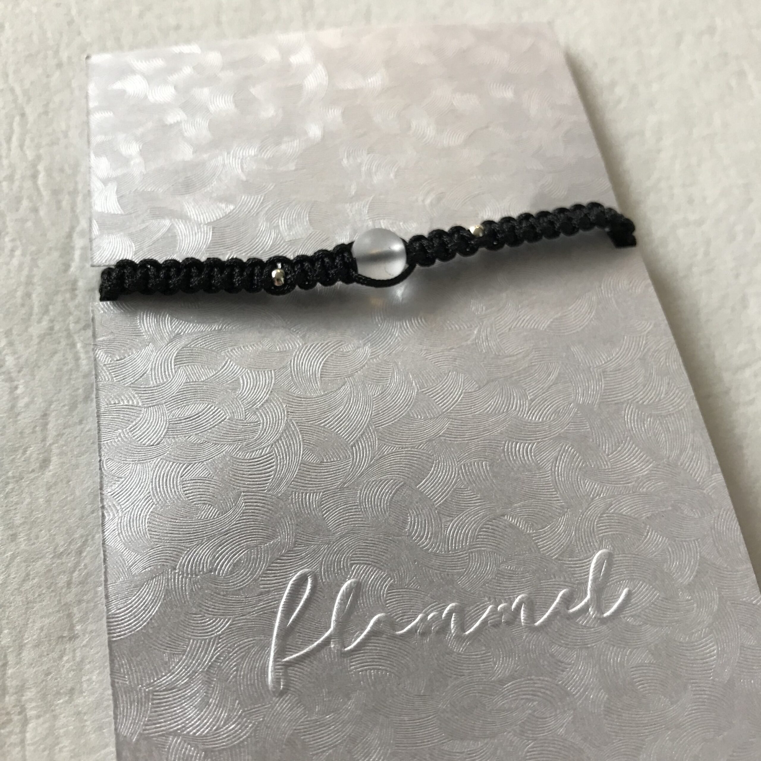 Černý macramé náramek flammel s křišťálem, minerálním kamenem čistoty a rovnováhy. Pohyblivý macramé uzel zaručuje univerzální velikost náramku.