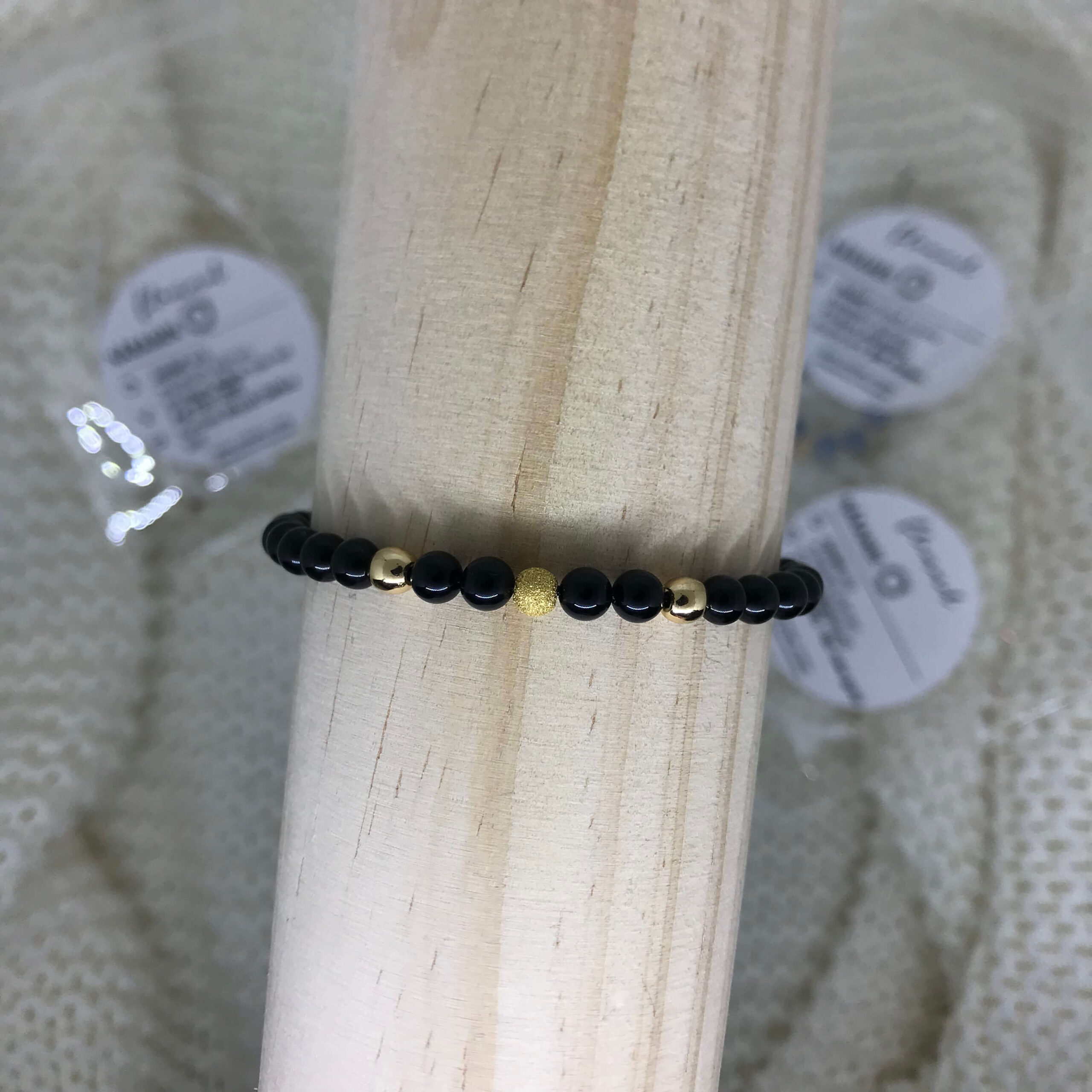 Náramek z černého onyxu a zlatého hematitu údajně dodává svému nositeli sebedůvěru, odvahu a sílu. Ladí v těle rovnováhu jin a jang. Je ideální pro náročná životní období.