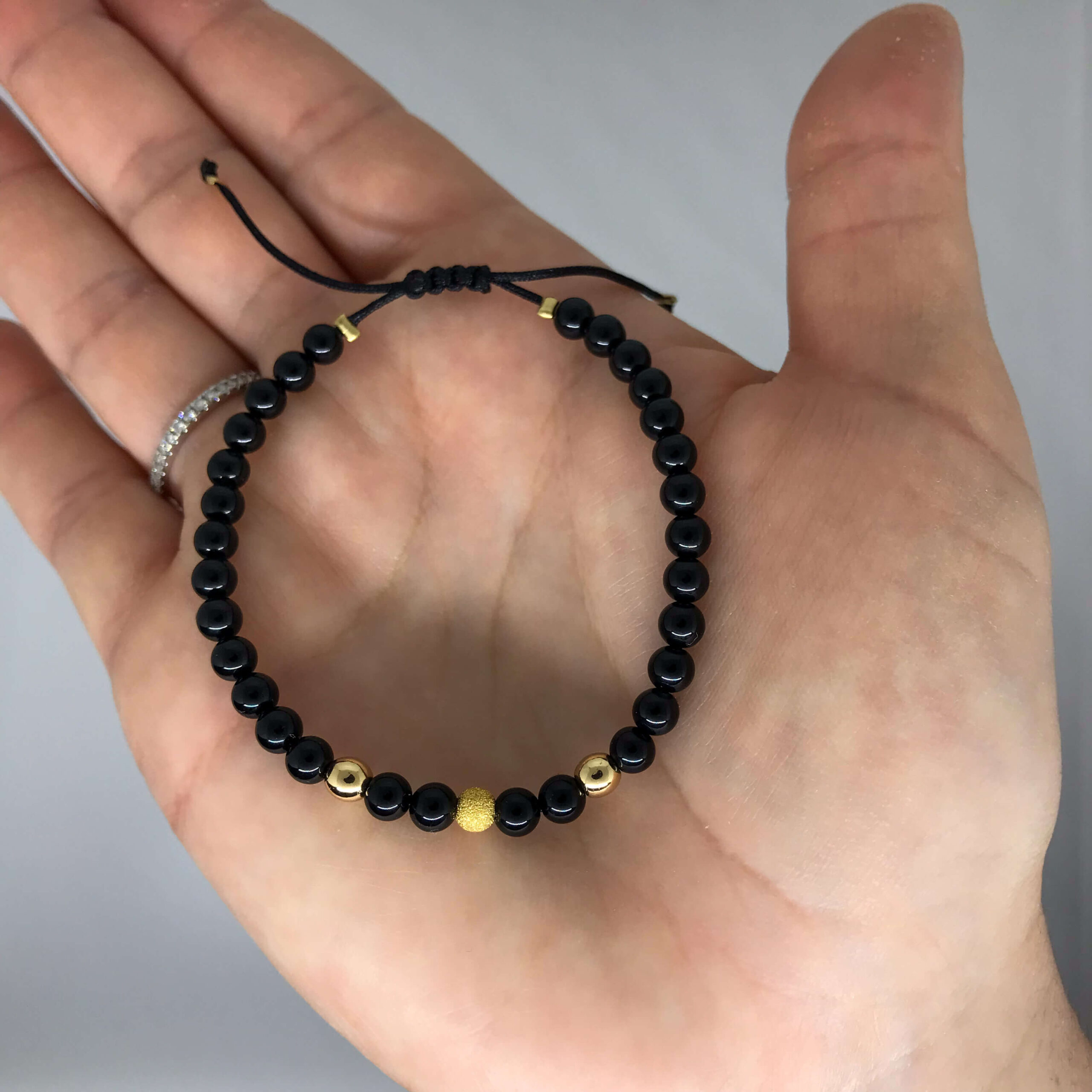 Elegantní a decentní náramek s minerálními kameny černý onyx a zlatý hematit je doplněn o stříbrný korálek stardust pozlacený 24K zlatem. Posuvné zapínání z černé nylonové šňůry je zpracováno technikou macramé a zaručuje univerzální velikost náramku.