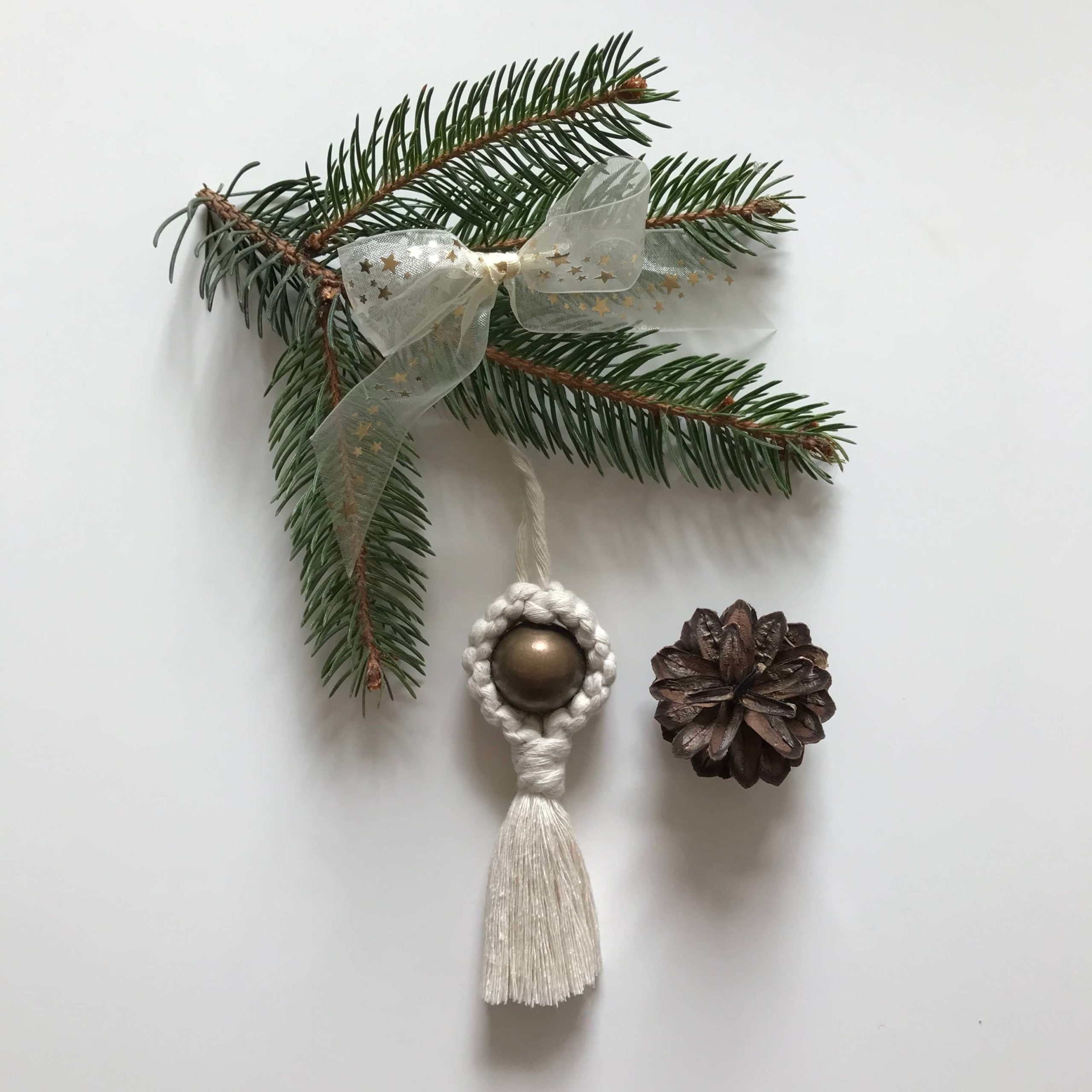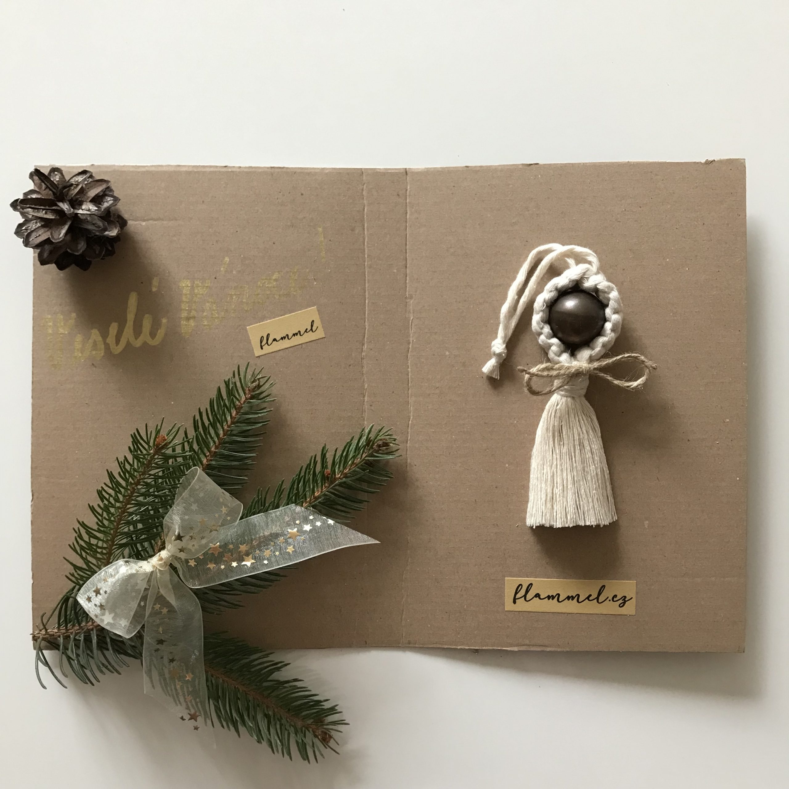 Macramé vánoční rolnička flammel je v nabídce také v dárkovém balení se čtyřmi dalšími vánočními ozdobami.
