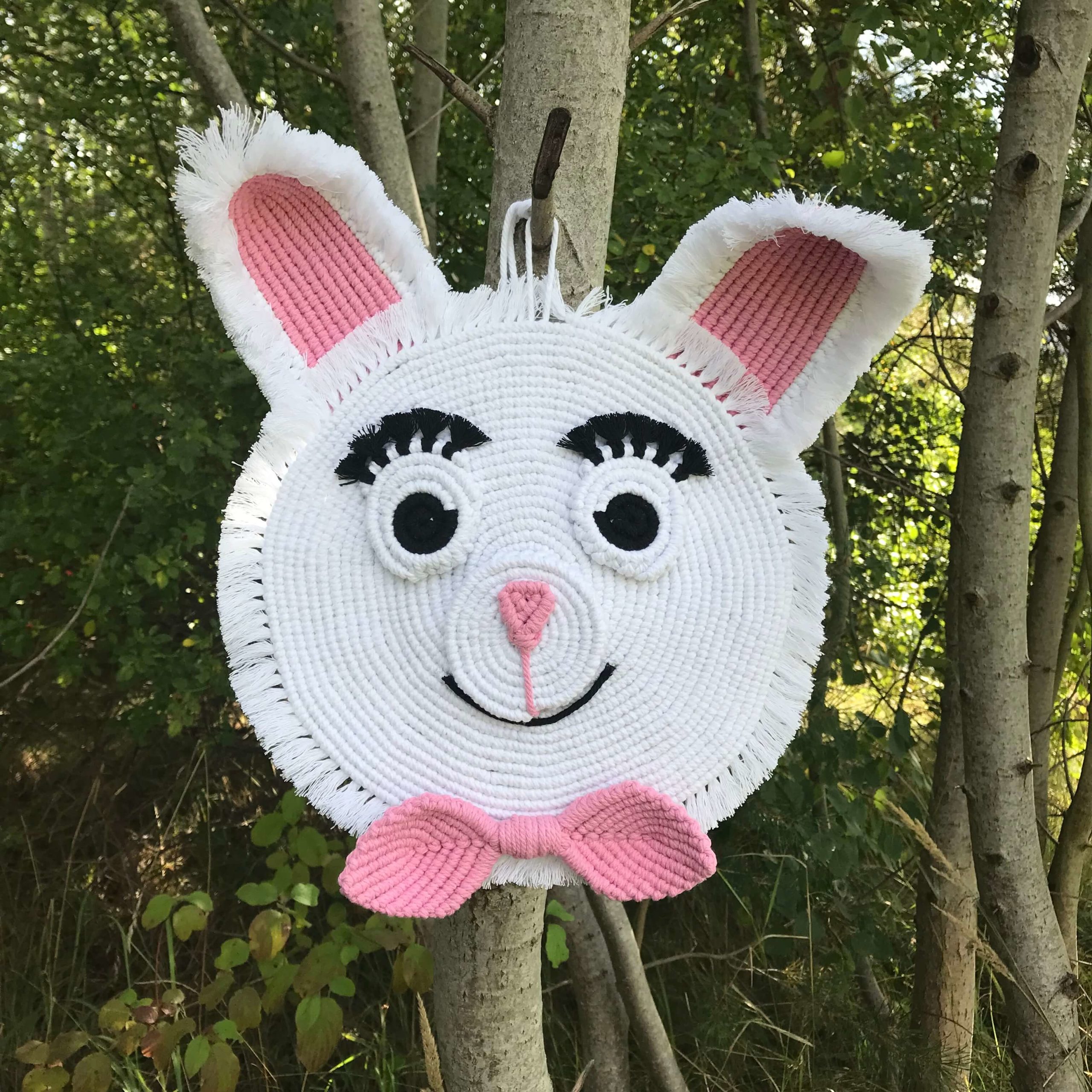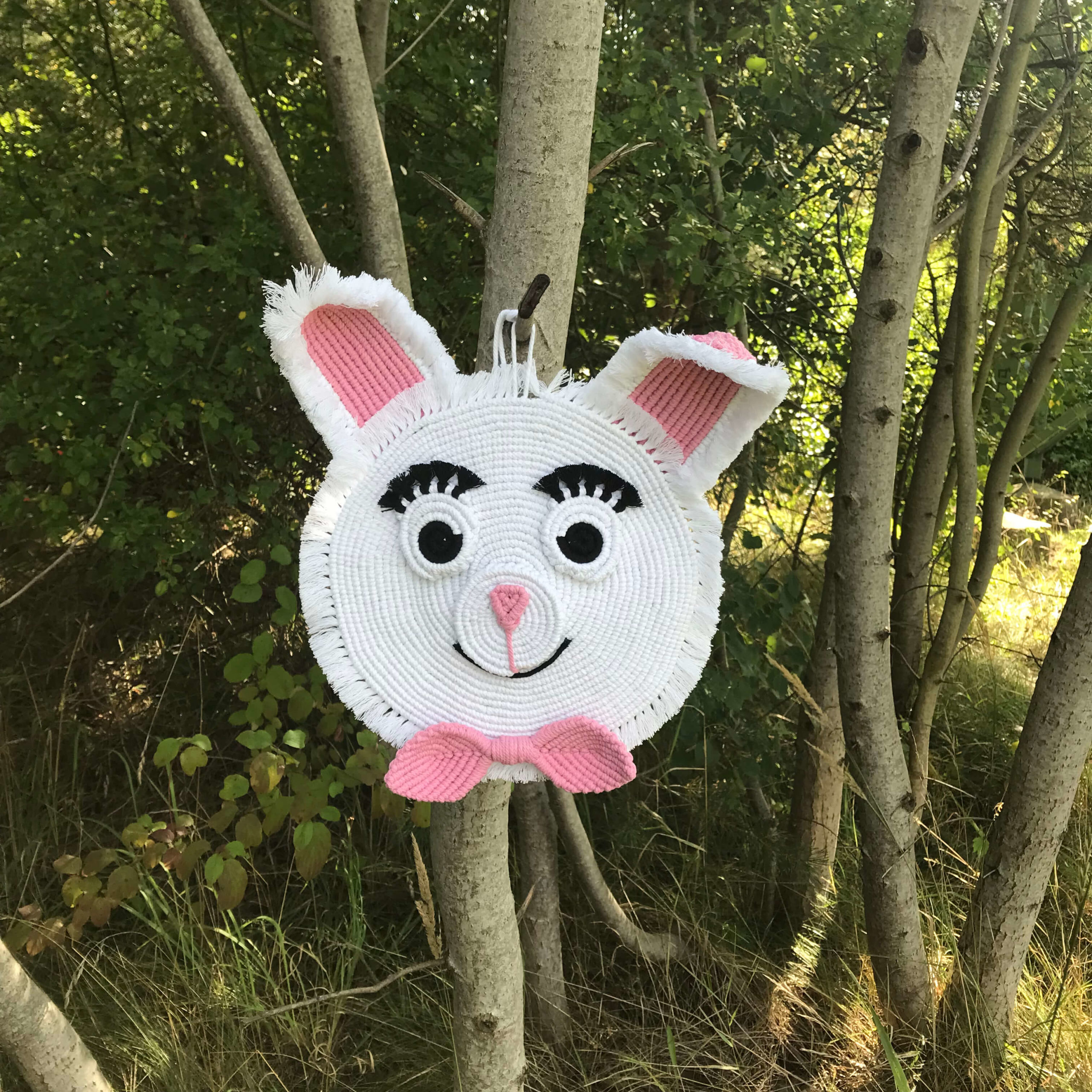 Macramé zajíc flammel – závěsná dekorace vyrobená drháním, což je technika vázání uzlů.