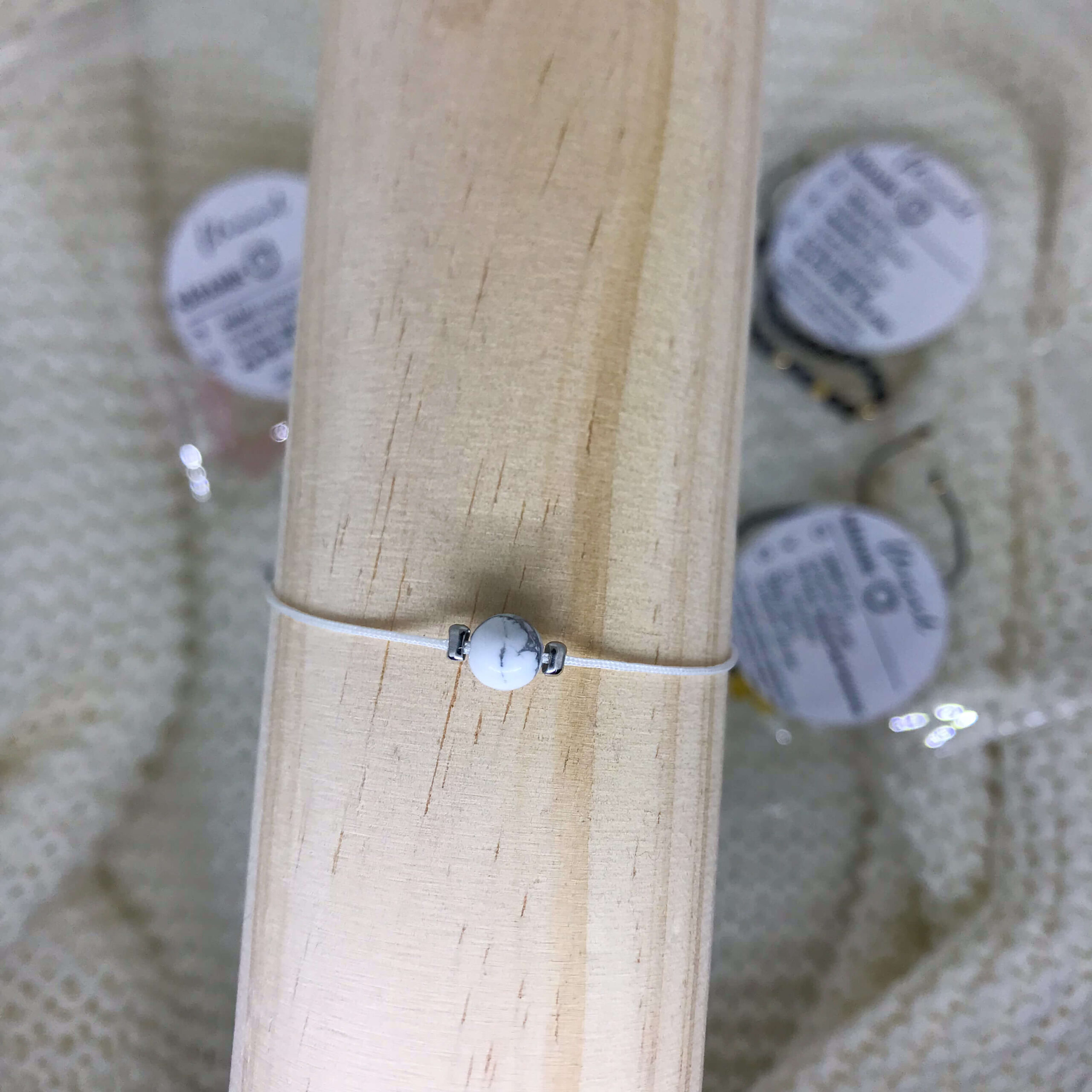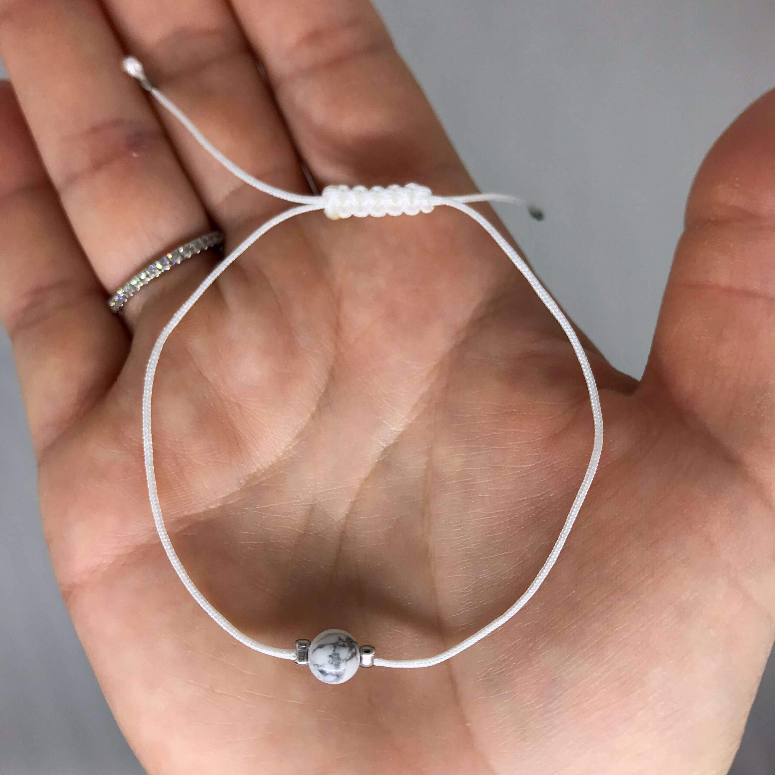 Bílý šňůrkový náramek s minerálním kamenem howlit a macramé pohyblivým uzlem z kolekce šňůrkových šperků Perenelle.
