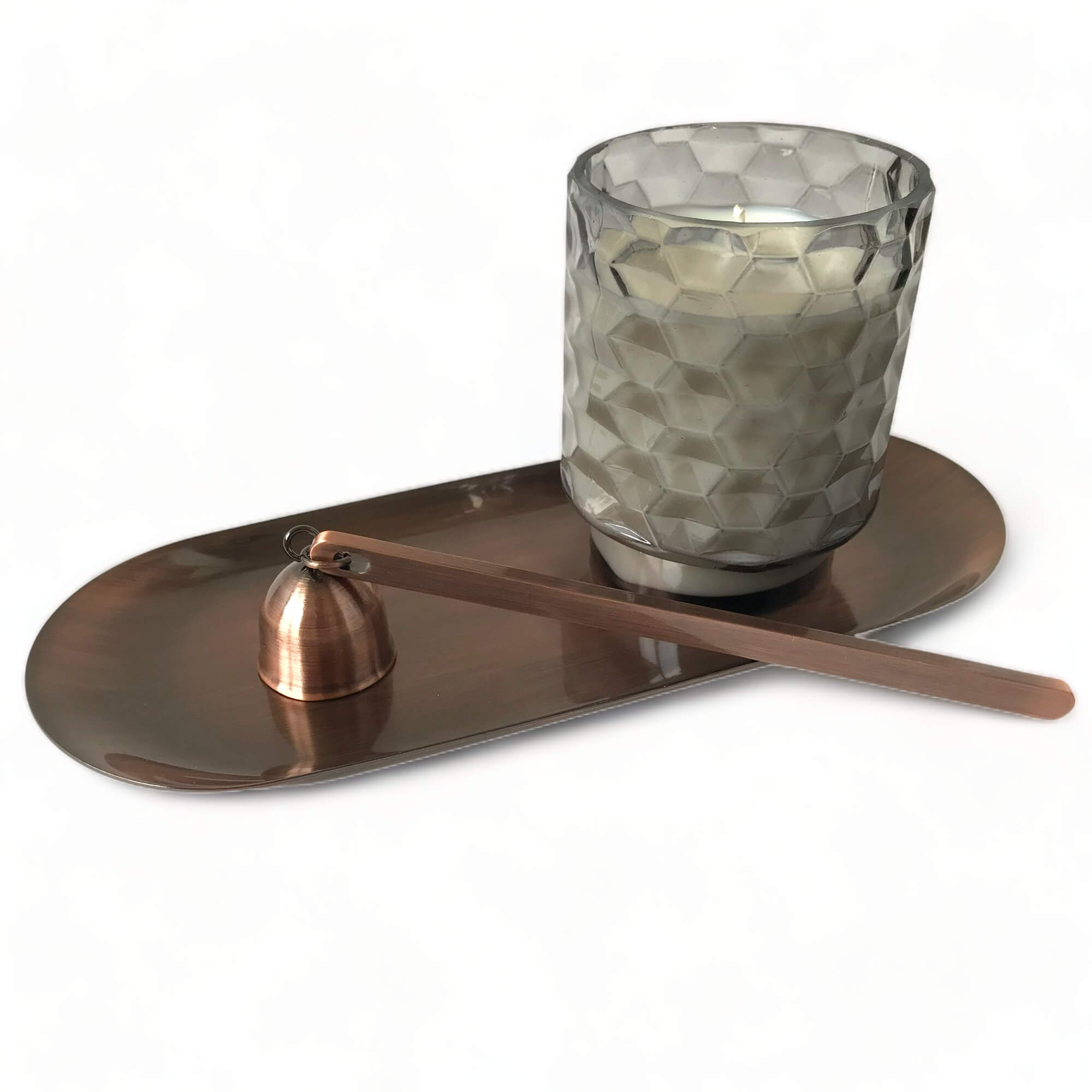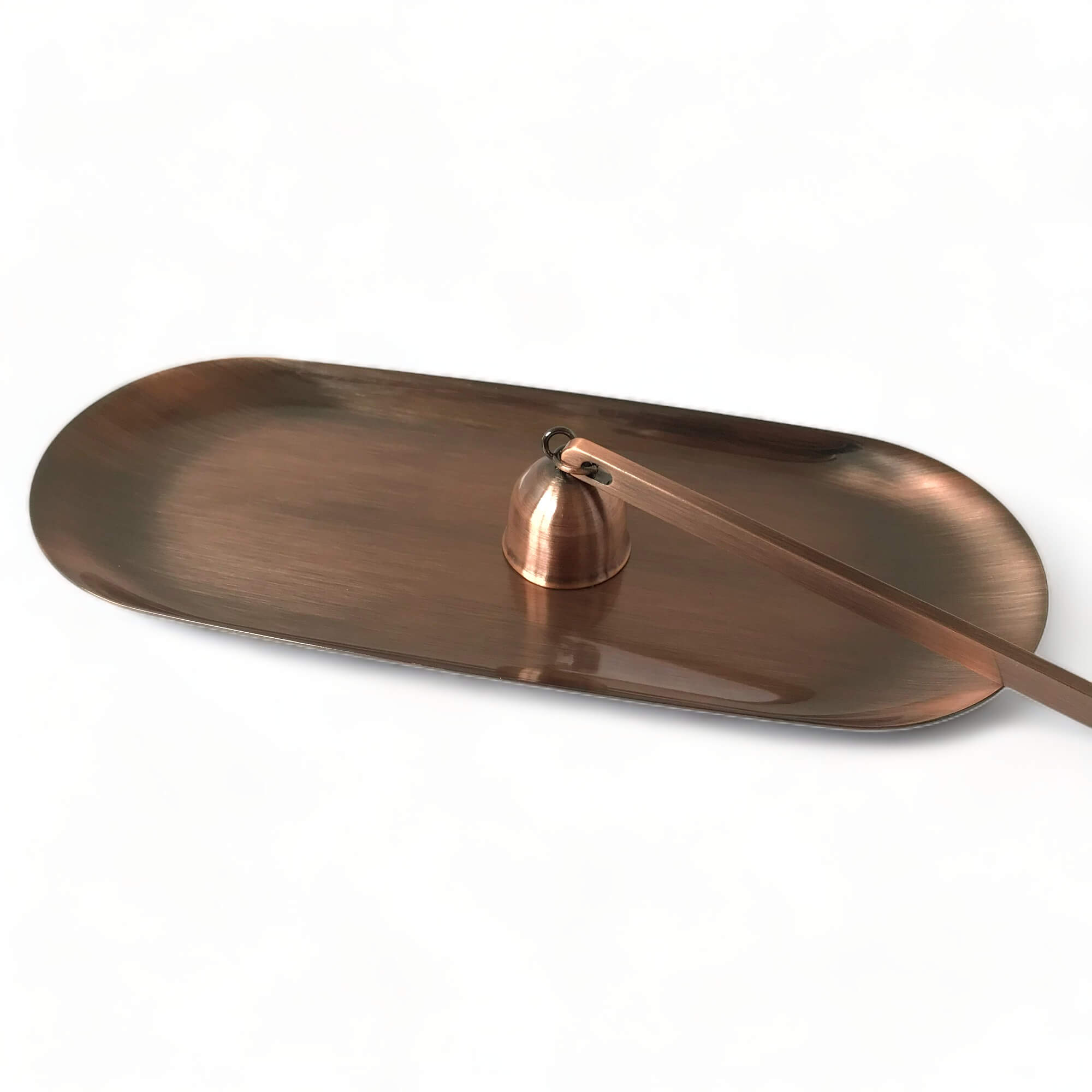 Tác pod svíčku a zhasínadlo z nerez oceli v barvě red bronze. Tác zabrání zahřívání plochy pod svíčkou a pomocí zhasínadla uhasíte svíčku bez dýmu. Kromě praktické stránky jde také o krásný doplněk, který ocení především milovníci svíček.